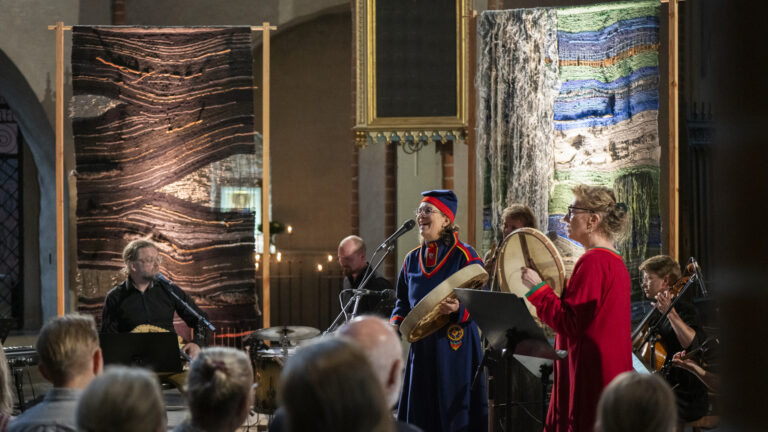 Spirit Land/Vuoiŋŋalaš Eanadat is a practice-based transdisciplinary artistic research project around animated Sámi landscapes. It is an act of decolonisation in a hybrid form, composed of textile art, music, and theology. Three cosmological spheres in traditional Sámi mythology – Jabbmeájjmo/Underworld, Eana/Earth, and Albmi/Heaven – are represented by monumental weavings, here set to music. Threads, different musical instruments, voices, sung and spoken words interact in a temporal cyclical performance.